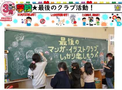 ◆コロナで活動があまりできなかったけど,色々なイラストなどをかけてうれしかったです!黒板に絵を描くというのも普段とは違うことをしていたので,とても新鮮でした!1年間ありがとうございました!