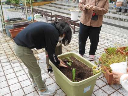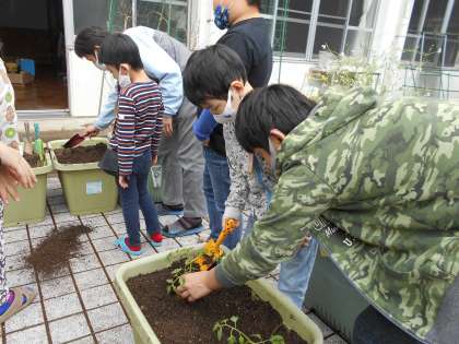 今年も中庭と体育館裏で野菜を育てます。子どもたちに育てる野菜をたずねると「スイカ」「サツマイモ」「カボチャ」「ナス」の答えが返ってきました。さっそくそれらの苗を購入,子達と一緒に植え方を確認して植えました。苗を植えるのに手慣れた子もいれば,土をあまり触りたくない子,先生と一緒に植える子など様々でした(スイカなどの他にとうもろこし・トマトも植えました)。自分たちが決めた野菜を大きく育て,夏には実がなることを楽しみにしたいです。