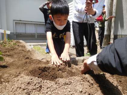 体育館横にあるたいよう学級の畑には,サツマイモの苗を植えました。苗を土の上に寝かせ,やさしく土をかぶせました。最後に,水やりもしました。