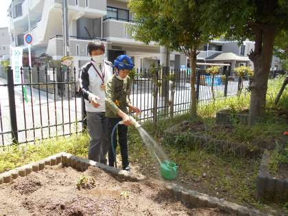 先日植えた野菜の苗は,毎朝みんなで水やりをしています。よく見ると,少し葉が増えてきました。来週からは,「おはようタイム」の中で,タブレットを使って観察記録をつけていきます。どのように大きくなっていくか,楽しみですね。