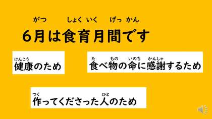 4月から給食がスタートして,約2か月が過ぎました。新学期での生活が慣れてきた6月に,また「食育基本法」が2005年6月に制定されたことから,6月イコール食育月間とされています。