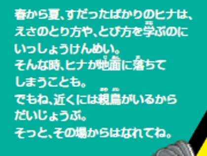 このようなヒナを見つけても決して手を出さず,できるだけ早くその場を離れるようにしましょう。