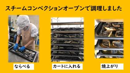 ゆず果汁・さとう・みりん・料理酒・濃口醤油に30分程度漬け込んださわらを,スチームコンベクションオーブンで焼上げました。