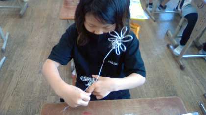 針金を曲げたり,切ったりペンチを上手に使いながら,思い思いの作品を作っています。