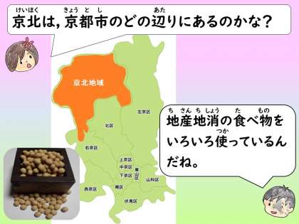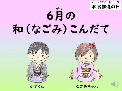 また,毎月の和献立のビデオ視聴も定着しています。和を「なごみ・かず」と読み,二人の登場人物が紹介します。物知りの「なごみちゃん」が,「かずくん」に京都の食べ物の事や,和献立の工夫について教えてくれます。