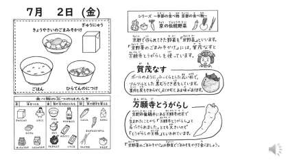 地産地消献立で,京都府産の「加茂なす」「万願寺とうがらし」が登場しました。