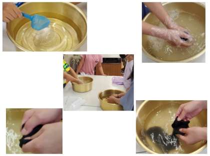 たらいに水の量に対する適量の洗濯石鹸を入れ,洗剤液を作り,くつ下を手洗いしていました!
