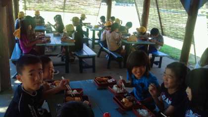 このあと、施設に入って「入所式・オリエンテーション・肝試しコースの散歩」と活動し、15時から野外炊事をに入ります。