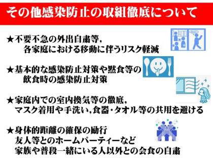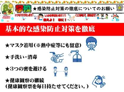 ご家庭におかれましても,子どもたちをはじめ,ご家庭や身近な方々が健康に過ごすことができますよう,感染防止対策にご留意いただきますようお願い申し上げます。