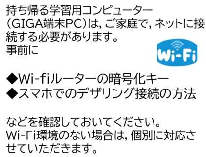 持ち帰る学習用コンピューター(GIGA端末PC)は,ご家庭で,ネットに接続する必要がありますので,