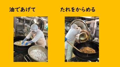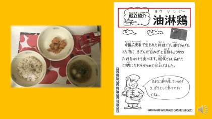 今日は,中国広東省で生まれた「油淋鶏:ヨウリンジー」でした。油で揚げた鶏肉に,きざんだ白ネギと甘酢しょうゆのたれをかけて食べます。給食では揚げた鶏肉にたれをかからめて仕上げました。たれに米酢を使っているのでさっぱりとして食べやすかったです。