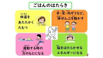 どのクラスも目に見えてフードロスがなくなってきました。しかし麦ごはんの時は食べにくい傾向があり,ごはんの働きについて給食パワーポイントで紹介しました。