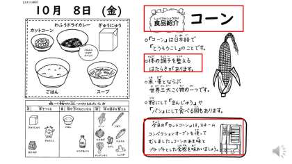 今日は,スチーコンベクションオーブンで蒸した「コーン」が登場しました。甘味があり,プチプチとした食感を楽しみました。