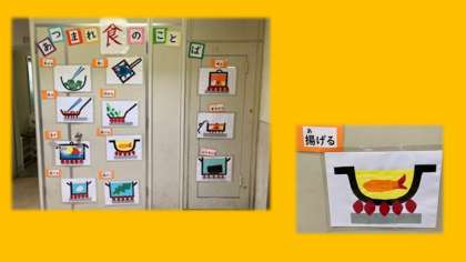給食室前に先輩栄養教諭さんのまねて食に関する言葉を掲示しました。