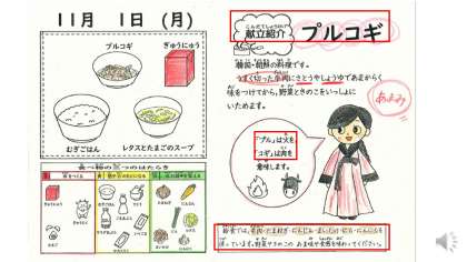 たまねぎ・にんじん・まいたけ・にらと野菜たっぷり彩り豊かなプルコギでした。甘辛い味付けでご飯がすすみました。