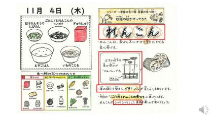 秋から冬にかけておいしい「れんこん」を使った豚肉とれんこんの煮つけは,シャキシャキとした食感が楽しく,甘辛い味付けはごはんが進みました。