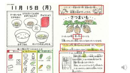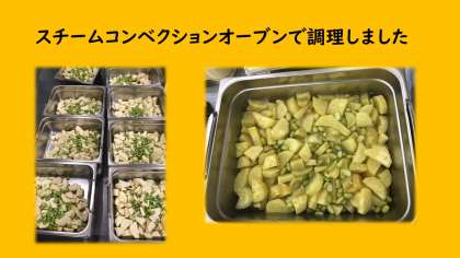 今日は,スチームコンベクションオーブンで「さつまいもの栂尾煮」を調理しました。丁寧に皮をむいたさつまいもと枝豆に,定量の水・みりん・さとう・塩の合せ調味料を入れて加熱調理しました。ふっくらとしたさつまいもの優しい甘味を味わいました。