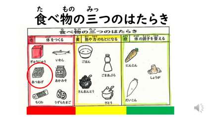 今日は,関東煮に使われている厚揚げと,いわしのかわり煮に使われている赤みそがすがたをかえる大豆ちゃんでした。