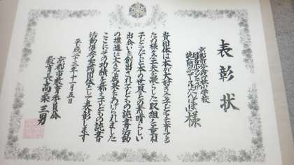 久我の杜小学校の図書室の整備や子どもたちへの読み聞かせの活動を通して、子どもたちの読書活動を支えてくださっている読書ボランティアの皆さん、そして読み聞かせサークル「たんぽぽ」の皆さんが「京都市子どもの読書活動優秀実践団体表彰」で「教育長表彰」を受けられました。