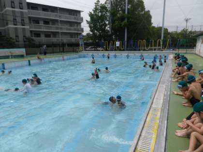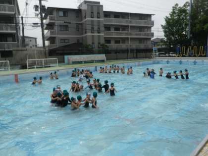 今日は,水のかけあいやじゃんけん列車,二人組での「曳き舟」等の活動をしました。