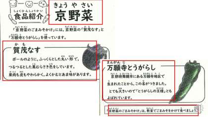 給食室には立派な京都府産の「万願寺とうがらし」と「加茂なす」が納品されていました。