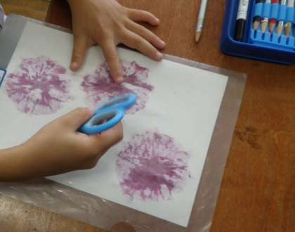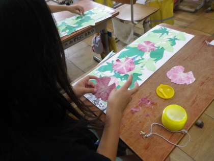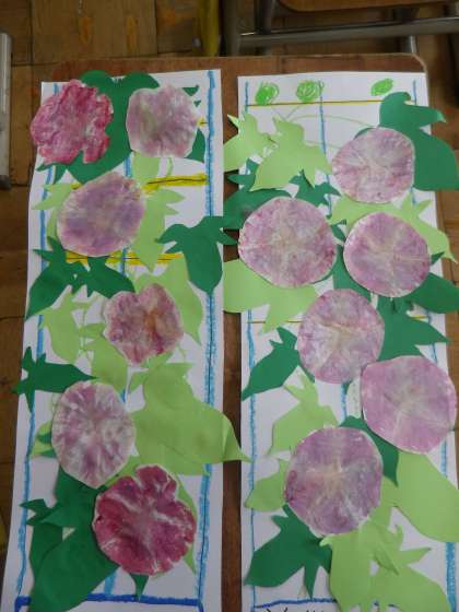 子ども達が大事に育てているあさがおの花を和紙に「たたき染め」しました。