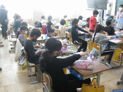 図工でペットボトルや空き容器を使って、作品を作りました。