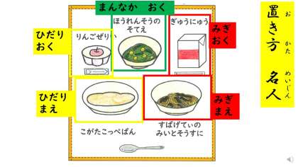 昨日1年生と一緒に学習した、手洗いの仕方、給食時間の待ち方、配膳方法、食器の置き方について、確認しながら進めていました。