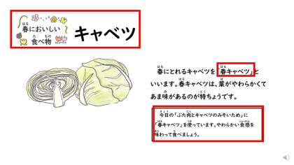 春キャベツの甘味と、みそ味がよく合い、ごはんが進む献立でした。