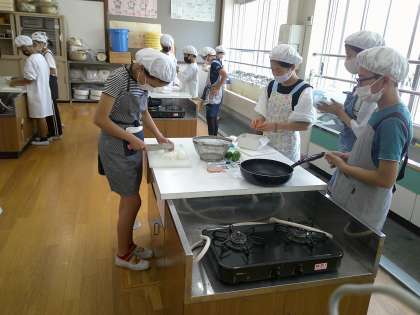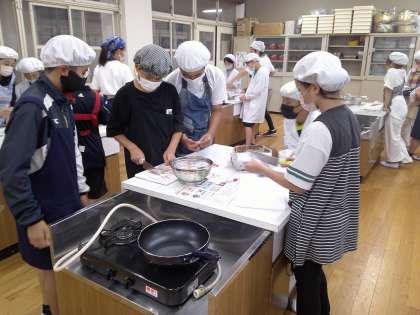 朝食の役割や栄養バランスを学習した後、調理実習をしました。