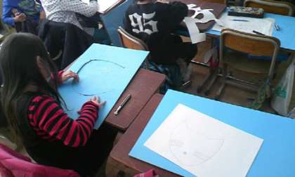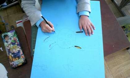 今日の2時間で,早くもダンボールに下描きし,描いた形を切り抜く作業に入った子もいました。