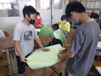 模造紙を布に、ミシンの縫い目をホッチキスにして考えました。
