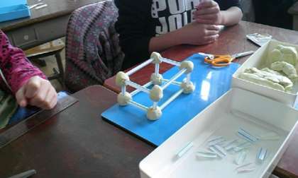 子どもたちは,黒板に描かれた箱の形を見て,「辺に見立てたストロー」と「頂点に見立ってた粘土」は幾つ用意すればいいのかを2人組になって考え,実際に組み立てました。