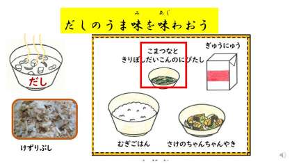 今日は「だしの先生」を招いて、だしの授業をおこないました。