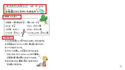 ごまの風味が感じられ、シャキシャキとした食感も楽しめた「小松菜とひじきのいためもの」でした。
