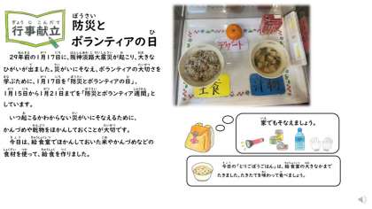 1月17日(水)の献立は、行事献立「防災とボランティアの日」