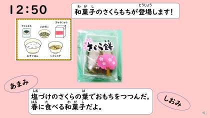 あんこの「甘味」と、塩漬けされたさくらの葉の「塩味」を見つけながら食べようと給食ビデオで伝えました。