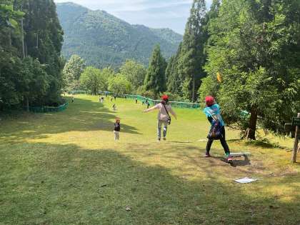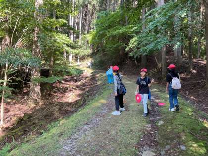 1日目、昼の活動「フライングディスク」です。班で協力しゴール目指してディスクを投げます。初めはなかなか思うように投げられなかったですが、慣れてくると思うところにディスクが飛ぶようになりました!広い芝生の上や山道で楽しそうに活動していました!