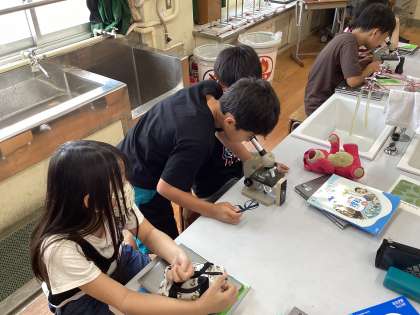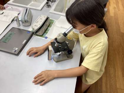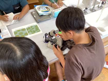 理科の学習で、顕微鏡を使ってヘチマとアサガオの花粉を観察しました。普段は見えない世界に興味津々で、楽しそうに学習をしていました。