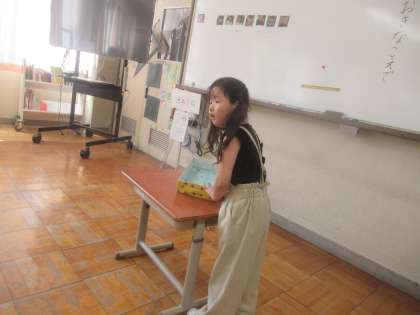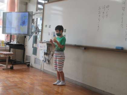 夏休みの思い出の絵日記を発表しました。「家族で海に行きました。」「映画を見に行きました。」「甲子園に行きました。」「旅行に行きました。」などたくさん思い出を発表していました。発表を聞いている子どもたちも、「どこに行ったのですか?」「昼ご飯は何を食べましたか?」などたくさん質問していました。自由研究作品では、それぞれ頑張ったところや難しかったところ、工夫したところなど発表して教えてくれました。