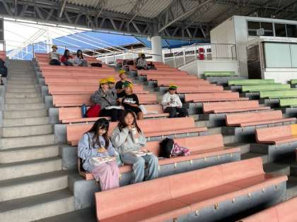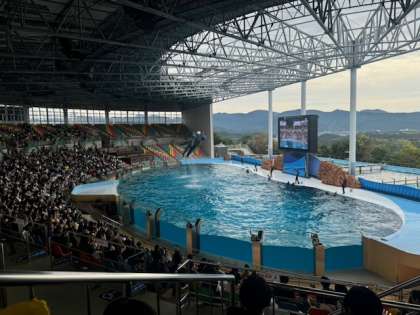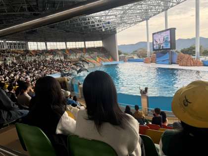 アドベンチャーワールドのイルカショーです。その素晴らしさに歓声があがります。お弁当を食べて、グループ活動再開です!