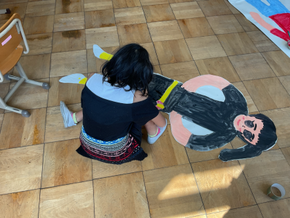 みんなで協力して体を型取り,色を塗って等身大の自分をつくりました。