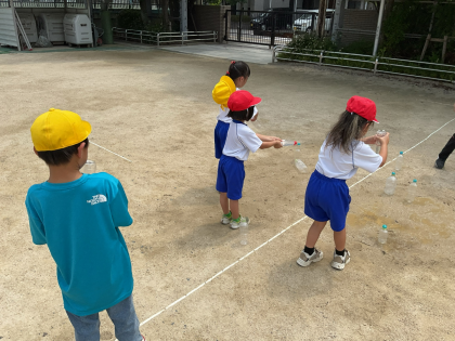 ペットボトルやマヨネーズなどの空き容器を使って、的あてや地面に絵をかきました。