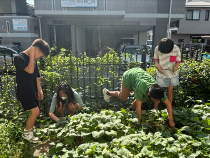 すごーい、葉っぱが増えた!うわぁ、雑草も増えたなぁ…。いろいろな話をしながら、雑草を抜いたり水やりをしたりと世話をしました。スイカは収穫できたものをみんなでいただきました。夏を感じたひと時でした。