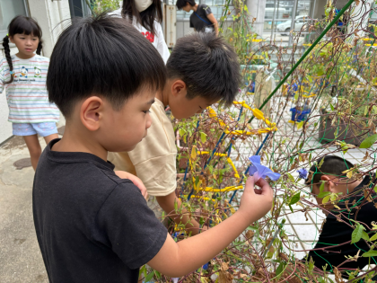 草木染をするために、朝顔の花びらをたくさん摘みました。どんな色や模様になるのか、楽しみです。