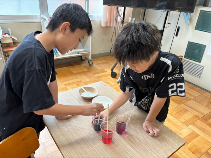 朝顔を使って色水遊びをしました。低学年は、クエン酸や重曹を混ぜて色が変わる様子や泡がたくさん出る様子を見てとても楽しんでいました。高学年は、「色が変わった!」「すごい!泡が出た!」など変化を感じることができました。入れる粉によって違う色に変化することを知ったり、酸性やアルカリ性、中性を知ったり、泡は二酸化炭素だということを知ったり、学習することができました。