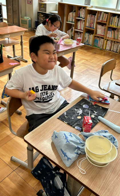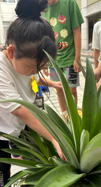 ずっと育てていたパイナップルがやっと実になりました!「パイナップルができてる!」「色が黄色になっている!」「甘い匂いがする!」など変化に気づき、食べるときを楽しみにしていました。「こんな風にできるんや!」「学校で育てられるんや!」など驚いていました。食べてみると、とても甘くておいしかったです。食べた後の葉っぱを土に植えておくと、またパイナップルができると聞いて、子どもたちも驚いていました。これから育てていきたいと思います。