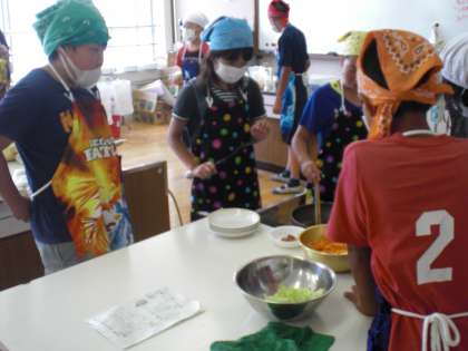 今週は6年生調理実習ウィークです。野菜炒めを作りました。分担して短冊切り,千切りにも挑戦。塩コショウで味付けしていただきました。「あ〜おいしい〜!」友だちと調理した野菜炒めは格別なようです。クーラーのない家庭科室でお家の人や給食調理員さんの大変さも実感しましたよね。夏休みはお家でも作ってみよう!野菜炒めは私たちにお任せください!