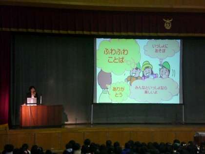 校長先生から相手の心を傷つける「ちくちくことば」と相手の気持ちをやさしく包む「ふわふわことば」の話がありました。