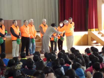 最後の朝会では,下校の様子を見守ってくださる「見守り隊」の方に感謝の言葉を伝えました。また,教育委員会から届けられた感謝状も渡ししました。